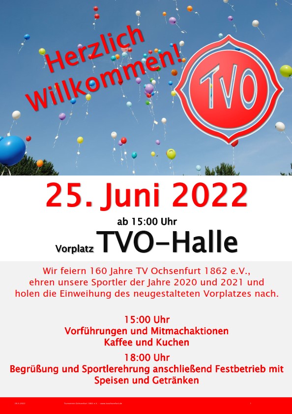 Endlich wieder ein Fest nach Corona! Wir feiern 160 Jahre TVOchsenfurt 1862 e.V., ehren unsere Sportler der Jahre 2020 und 2021 und holen die Einweihung des neugestalteten Vorplatzes an der TVO-Halle nach.